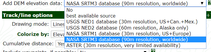 ![]() 「ファイル選択」をクリックし、標高データをつけたいfileを選択。 次に画面下のAdd DEM elevation dataの右の窓の右にある▼を押す。 「NASA SRTM3・・・90m resolution, worldwide」を選択しクリック。 「NASA SRTM3・・・90m resolution, worldwide」以外にも選択肢はあるが地域が限られている。 対象が米国や欧州なら30m resolution等を選べば、解像度はよくなる。 all of Europe, Japan, South Korea, and Taiwan, as well as parts of Australia, New Zealand, and South Africa. のデータも含まれる。 ファイル選択ですでに標高データ付きのファイルを選択した場合はAdd DEM elevation dataは「NO」を選択。 |